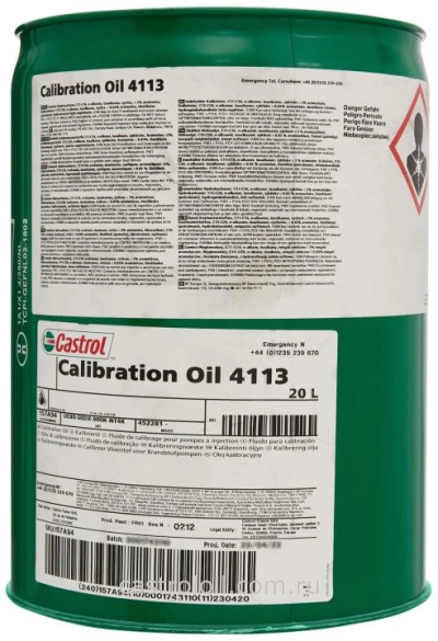 Castrol Calibration Oil 4113 - калибровочная жидкость для тестирования компонентов систем впрыска, полностью соответствующая спецификациям ISO 4113 и Lucas CAV 7-10-106. В состав продукта входят эффективные ингибиторы коррозии. Castrol Calibration Oil 4113 не содержит опасных присадок, но лёгкие минеральные масла могут вызывать обезжиривание кожи при попадании на незащищённые её участки. Рекомендуется использование защитного крема или других средств при работе с этим продуктом.