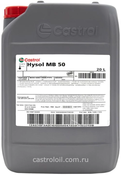 СОЖ Castrol Hysol MB 50 разработана для обработки чугуна, низко и среднелегированных сталей, высоколегированных нержавеющих сталей и алюминиевых сплавов. Рекомендуемые концентрации: шлифование 5-7%; общая механическая обработка 5-8%; сверление 6-8%; развертывание и нарезание резьбы 7-10%, протягивание 8-10%. Диапазон жесткости воды 100 – 1000 ppm CaCO3. Для оптимальной стабильности продукта предпочтительно храните продукт в помещении при температуре от 5 °C до 45 °C / от 41°F до 113 °F.